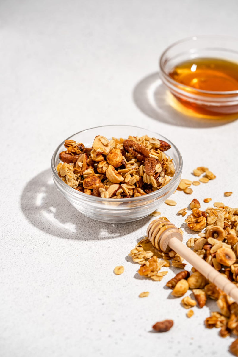 A rich blend of premium nuts including almonds, walnuts, hazelnuts, and pecans. Sweetened with honey and baked with heart-healthy olive oil.